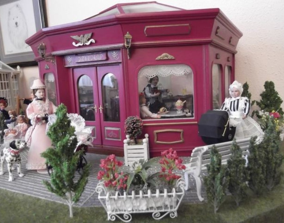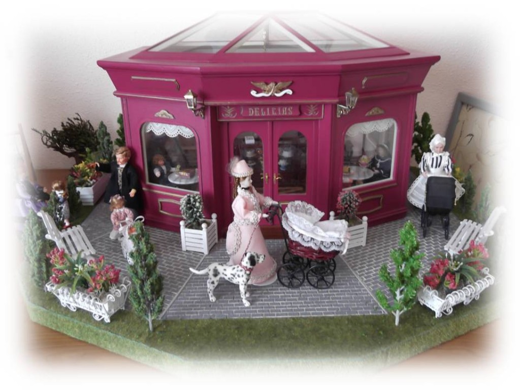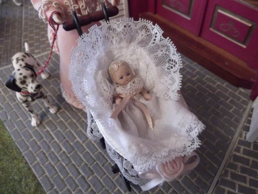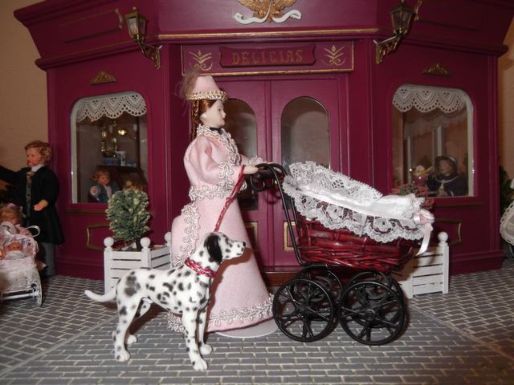 En esta foto, la pastelería está ya en mi casa y yo le he añadido algún detalle, como el perro Dálmata al que le hice un collar y una correa que combina con el vestido de la señora, hecho totalmente por mi madre y que es digno de admirar (sombrero incluido), así como la ropa del cochecito y del niño.