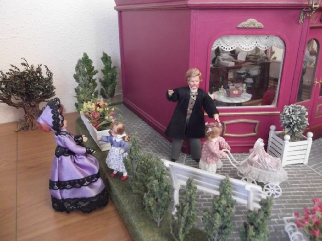 En el exterior, una pareja juega con sus hijas.El señor, de lo más elegante. La señora a la que también hizo la ropa mi madre, tiene historia, ya que perteneció a una familia que tuvimos mis hermanas y yo de pequeñas llamada Hogarín, que tenían habitaciones que se compraban por separado hasta conseguir tener una casa para ellos. Esta familia se componía de los padres, los abuelos, una hija mayor, un niño y una niña, un bebé y un perro. Todos ellos están hoy en día repartidos entre las casas de mis padres, ¡vamos! como las familias reales que al final terminan cada uno por su lado ¡je je!