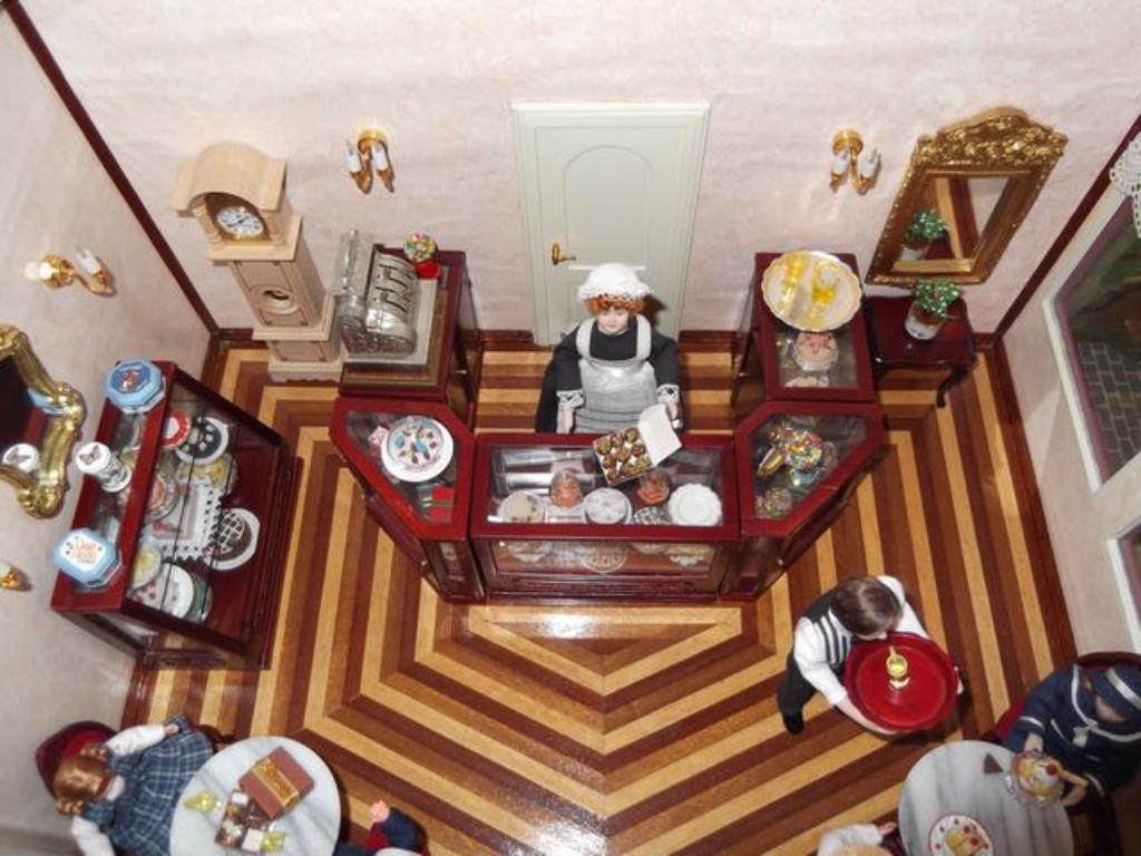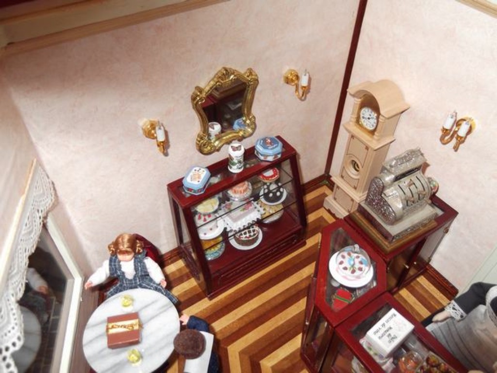 La caja registradora, funciona y su cajón se abre automáticamente. En las vitrinas: tartas, cajitas de regalo, pasteles, etc. ¡que ricooooo!
