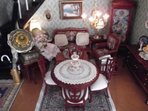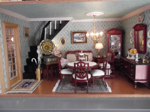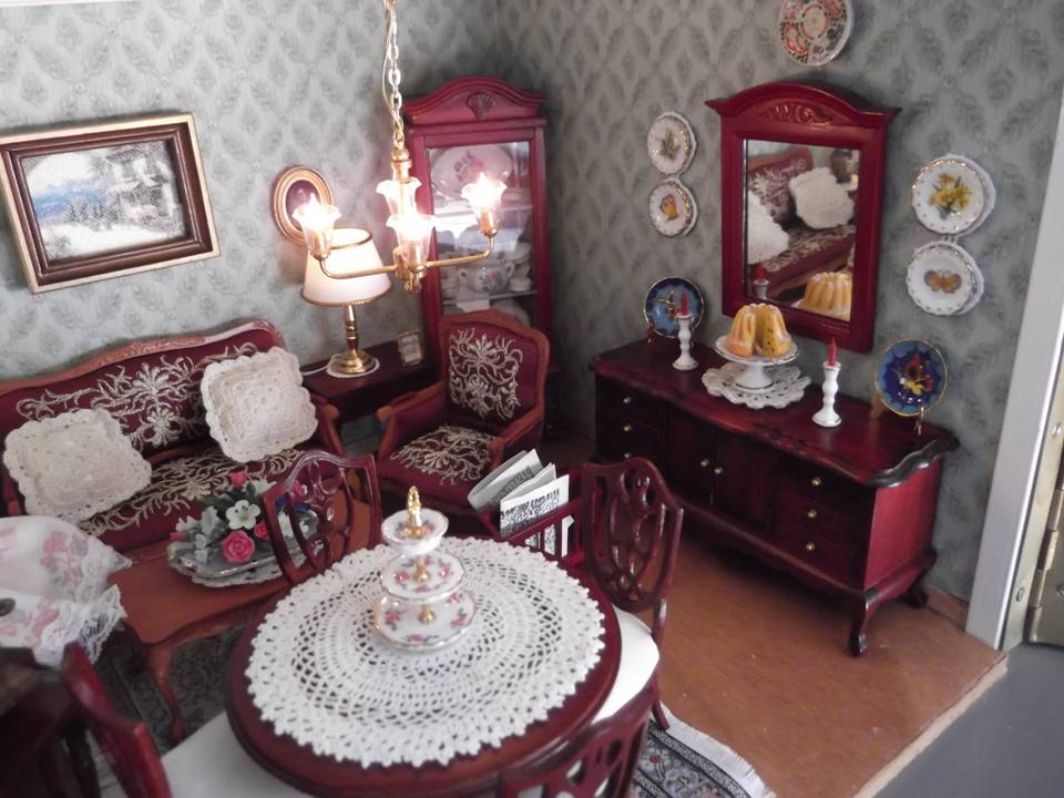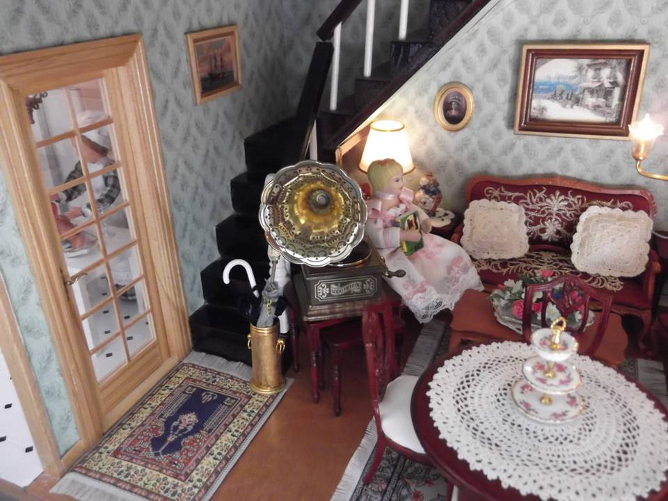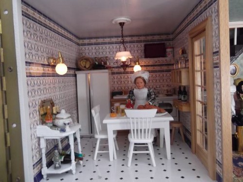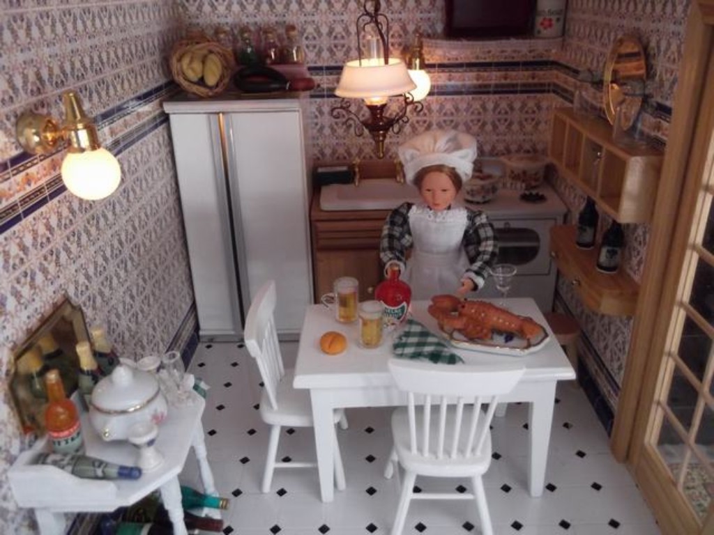 El tresillo, tapizado con bordados y también el centro floral de la mesita de café, son de lo más realistas.Los cuadros, la vitrina llena de vajilla, las lámparas, los platitos en la pared, los tapetes de la mesa, el mueble, los cojines.....¡este salón está al detalle! (Click en las imágenes para ampliar): La joya de esta habitación sin duda alguna es: "LA GRAMOLA"Una pequeña obra de arte. Al girar su manivela suena una música de aquellos tiempos. Preciosa miniatura en la que han cuidado cada detalle. A continuación puedes ver un vídeo de ella y escuchar su música. Si quieres apreciar mejor los detalles pon el vídeo a pantalla completa: "LA COCINA"