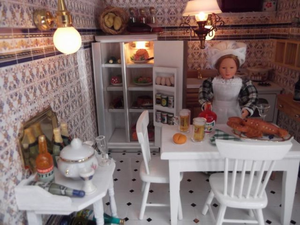 ¡Como se puede ver en la siguiente imagen, la nevera tiene luz!Los huevos colocados en su compartimento en la puerta y las latas de refresco, como en las neveras reales.Dentro, en las estanterías: botellas, embutidos, platos con comida, fruta.....¡que hambre!Y sobre la nevera un cestito con pan, tarros de especias y una bandeja con chorizos y morcillas.