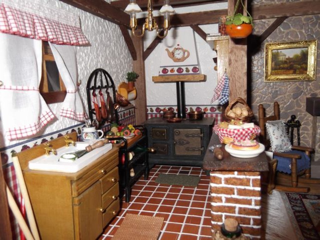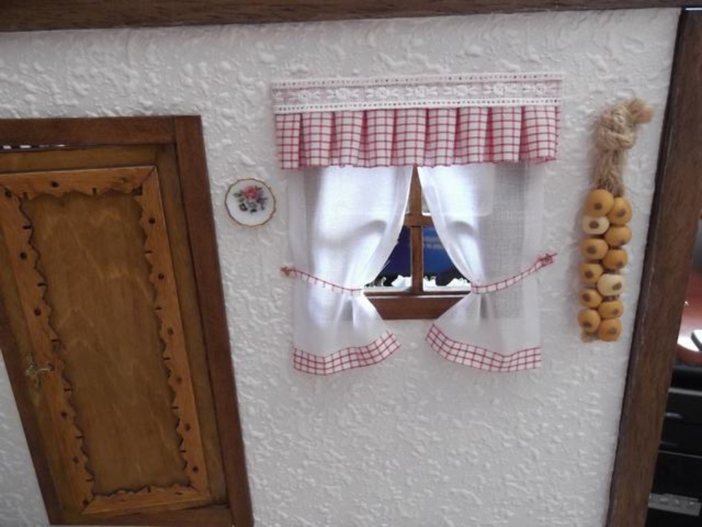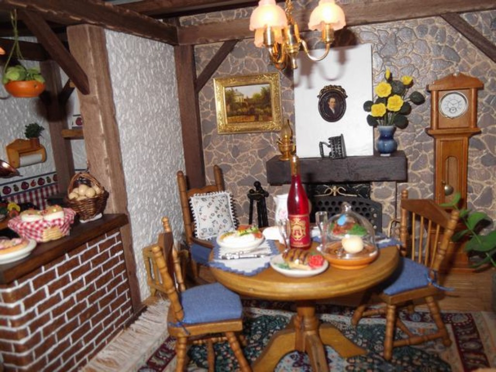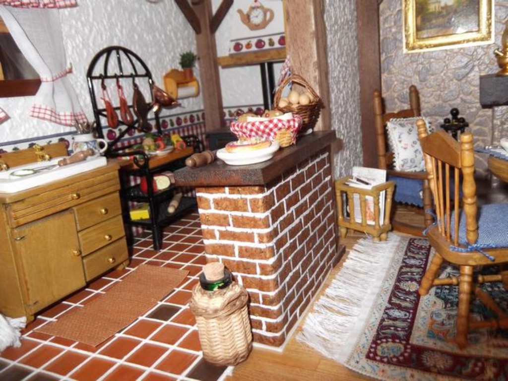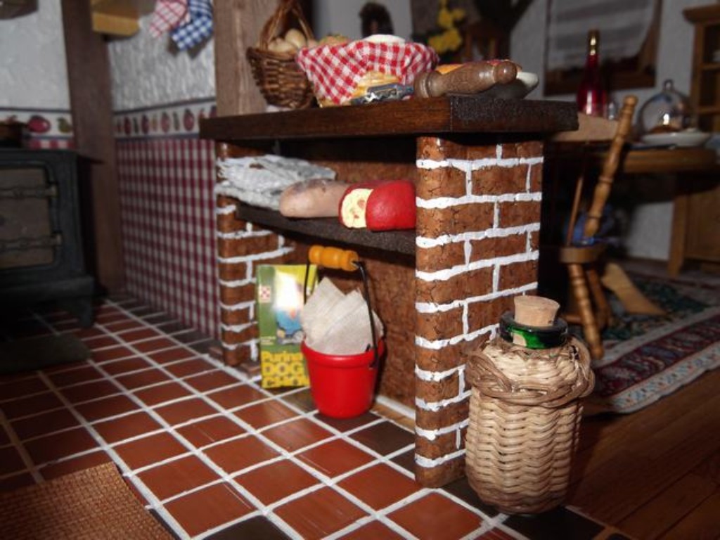 En el paso del comedor a la cocina, no había mostrador (no venía en los fascículos) pero yo lo puse como tantas otras cosas, porque me gustaba más así. Por supuesto lo hice yo entero. El efecto de los ladrillos lo hice con papel adhesivo imitación a corcho y le pinté las líneas blancas para darle realismo, luego un toque especial y....¡parecen ladrillos!Las vigas las golpeé antes de colocarlas para que pareciesen más reales, luego las lijé y barnicé y el resultado creo que mereció la pena.