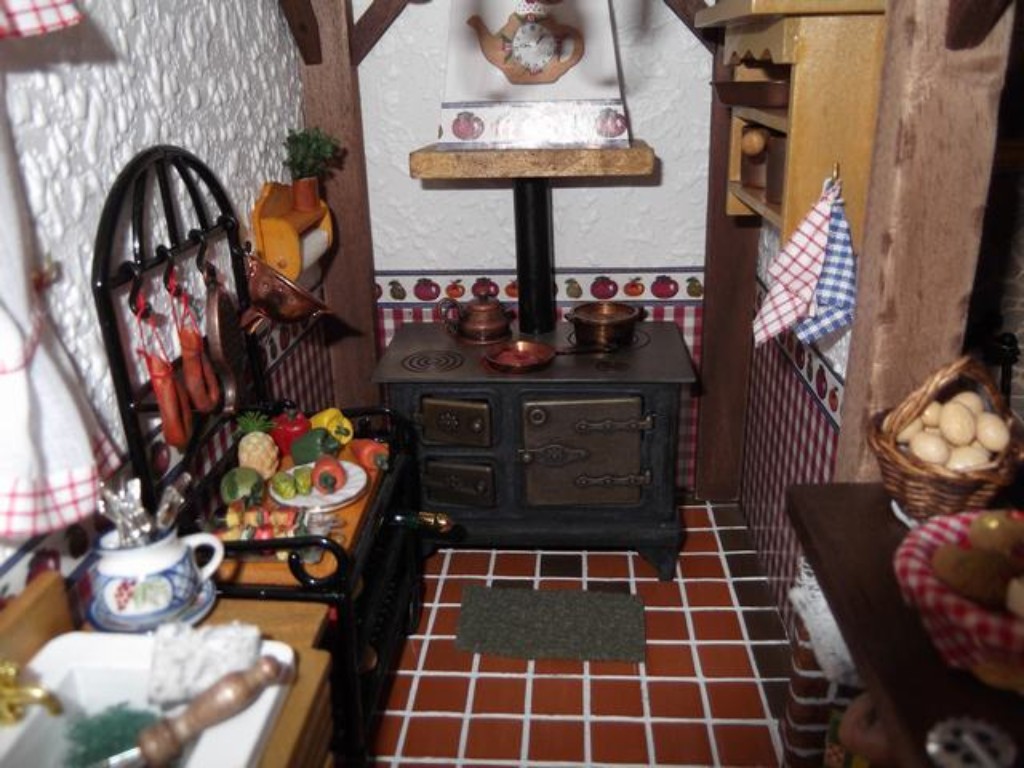La cocina de leña, parece desprender olor a humo como las verdaderas.Esos choricillos sin conservantes ni colorantes........¡de pueblo! ¡ñam ñam! colgados en ese bonito mueble de forja....y las verduritas de la huerta......Tampoco podía faltar el típico tarrito de cuajada con perejil para los guisos, que está colocado junto a la cocina sobre el rollo de papel de cocina.