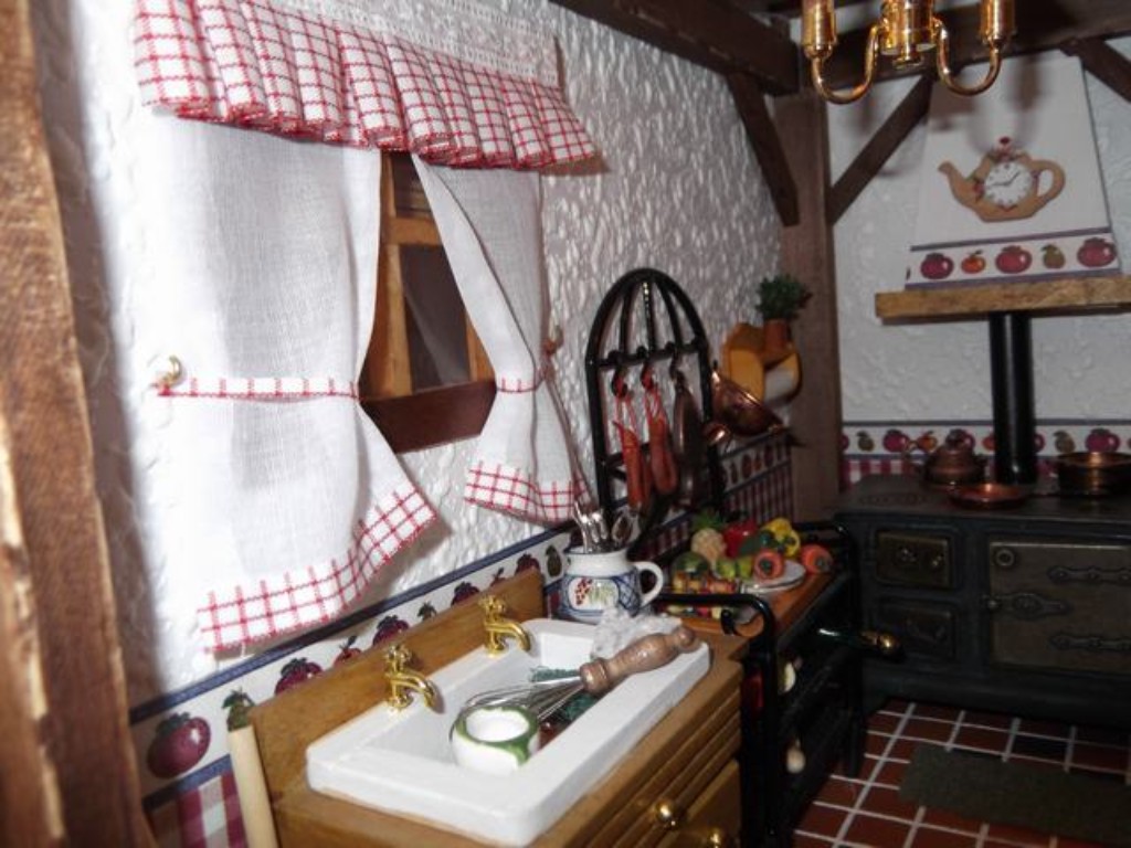 Junto a la fregadera una jarrita llena de cubiertos recién lavados.Dentro, un estropajo verde y más cacharros para fregar.No perdáis de vista la cestita con huevos sobre el mostrador ¡parecen reales!Y ¿que me decís de las cortinas? me quedaron bien ¿no?