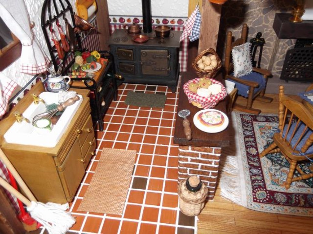 No podían faltar en la cocina, la fregona y el escobón (junto a la fregadera) debajo del mostrador está el cubo, trapos de limpieza, el saco de pienso del perro, un queso y un pan que yo hice con pasta de moldear.