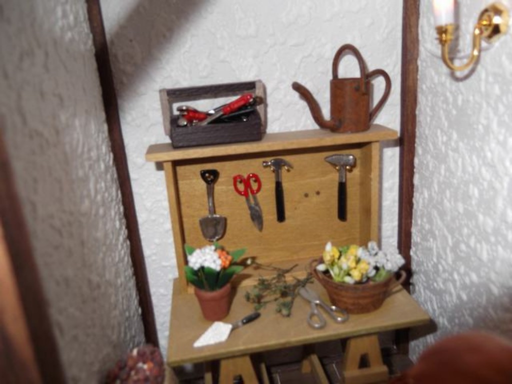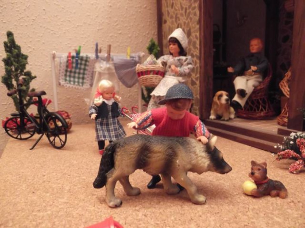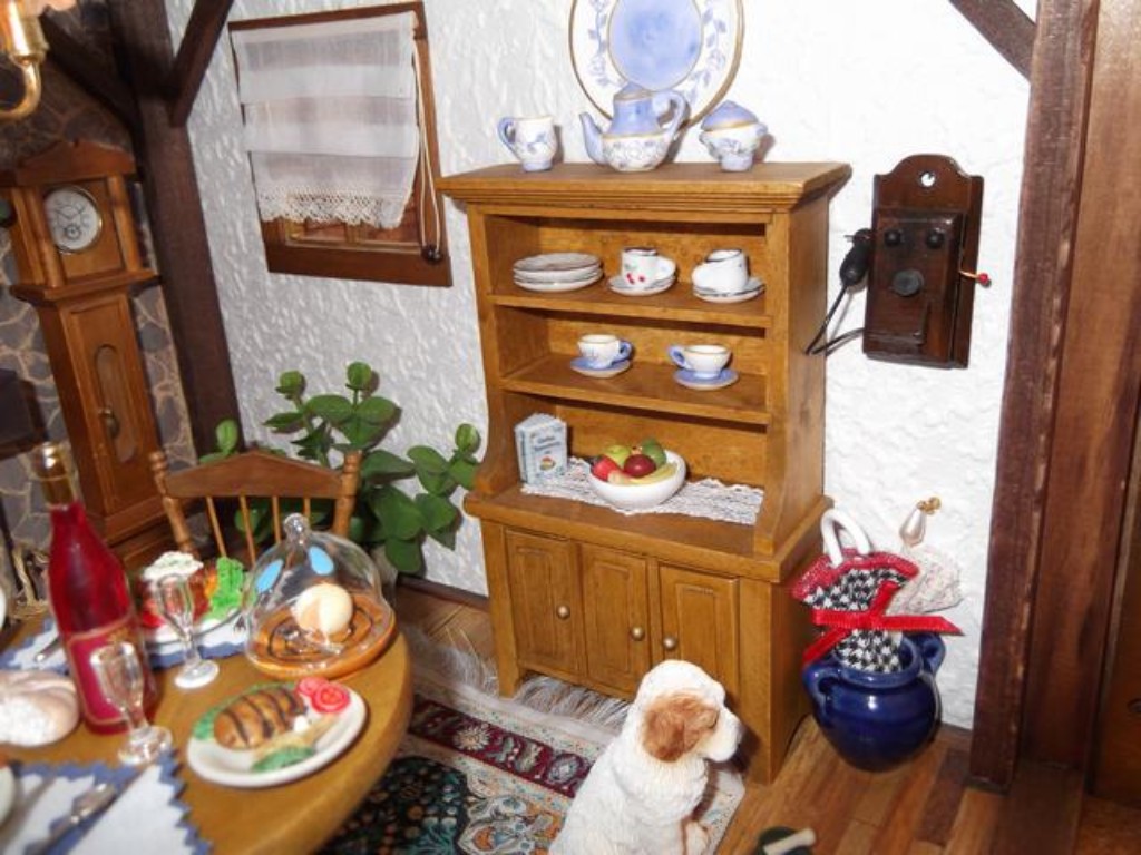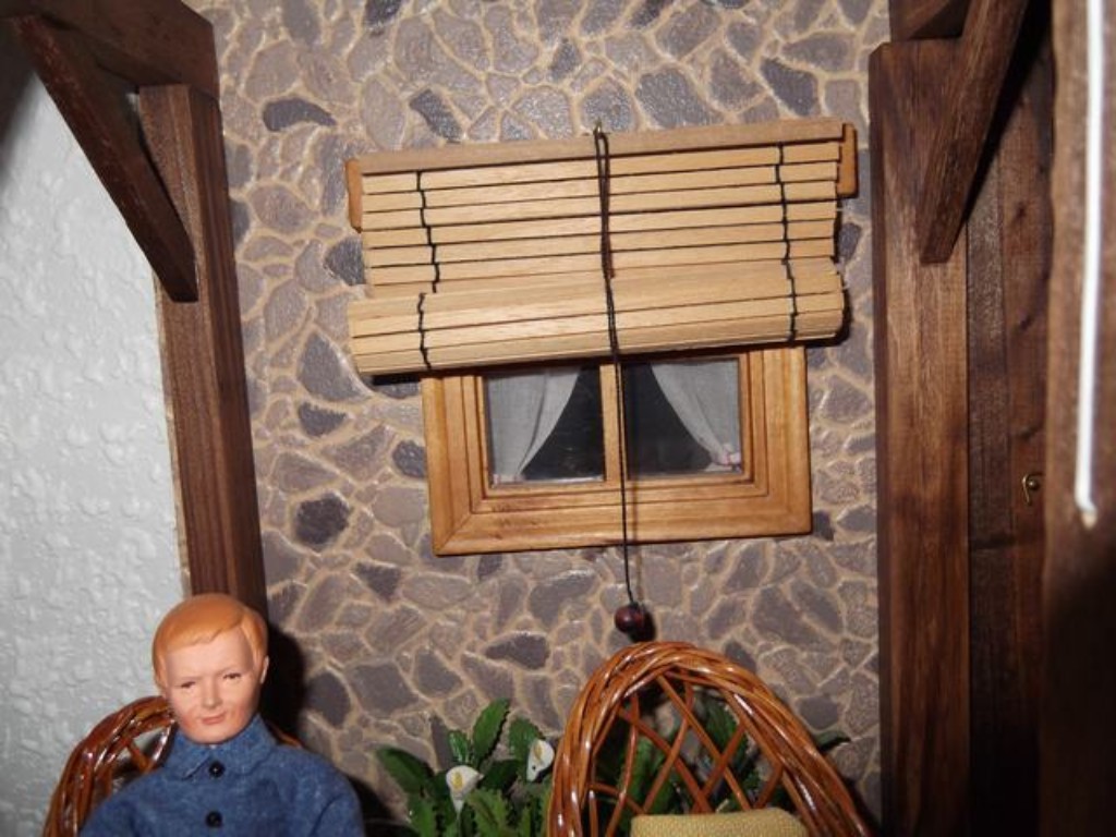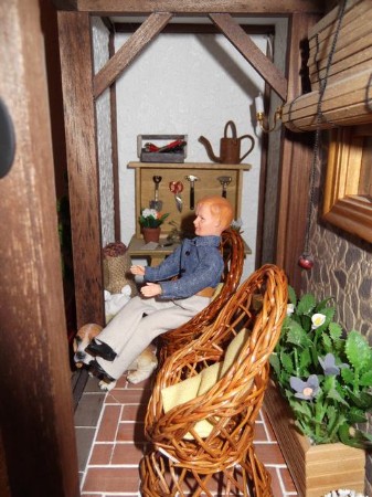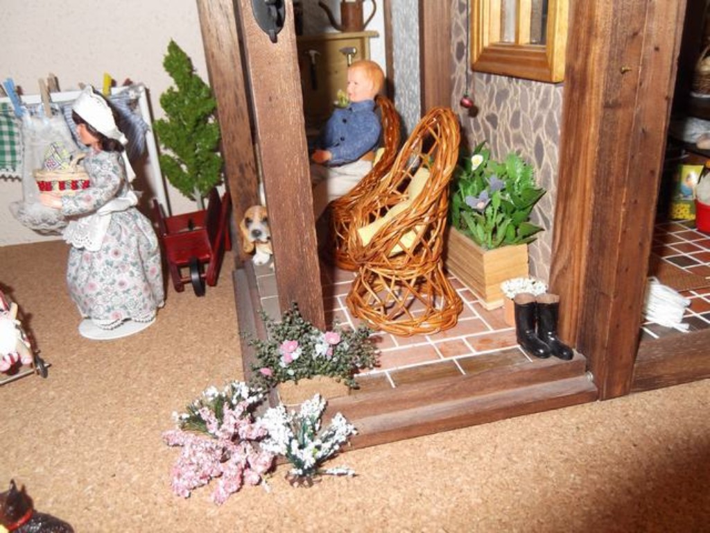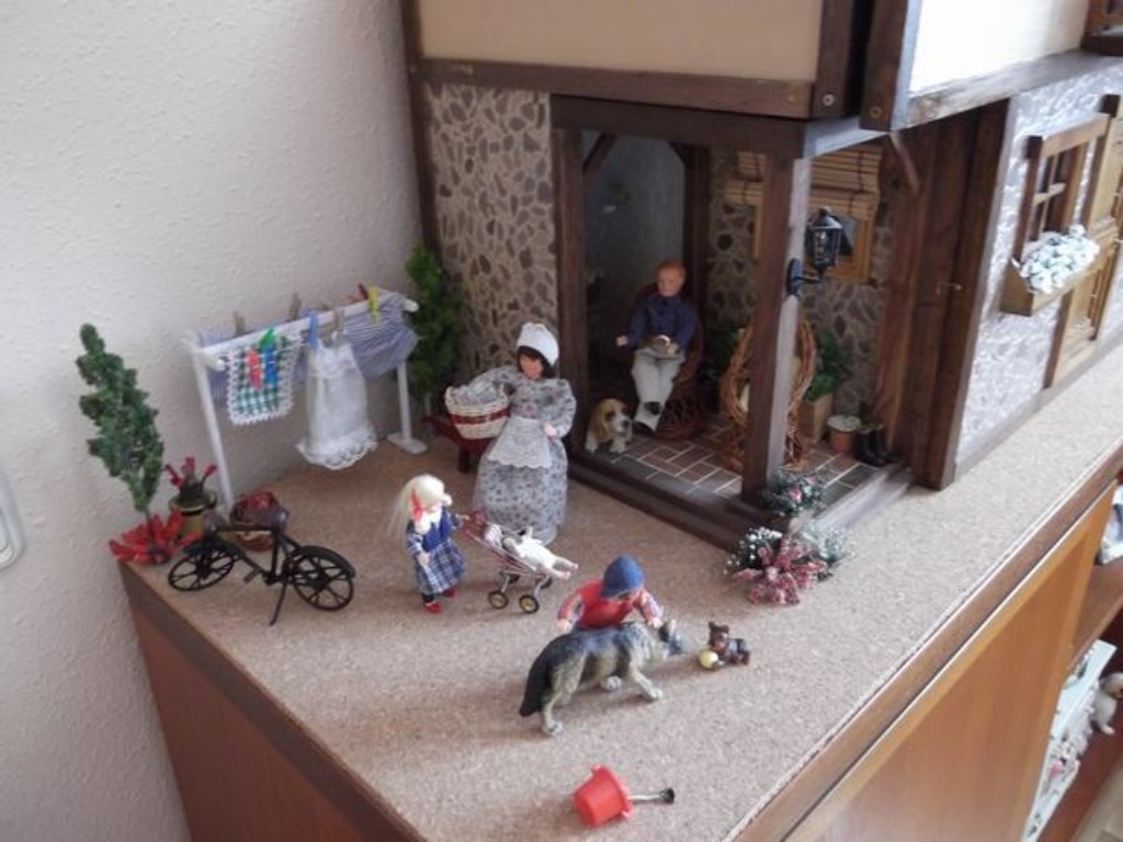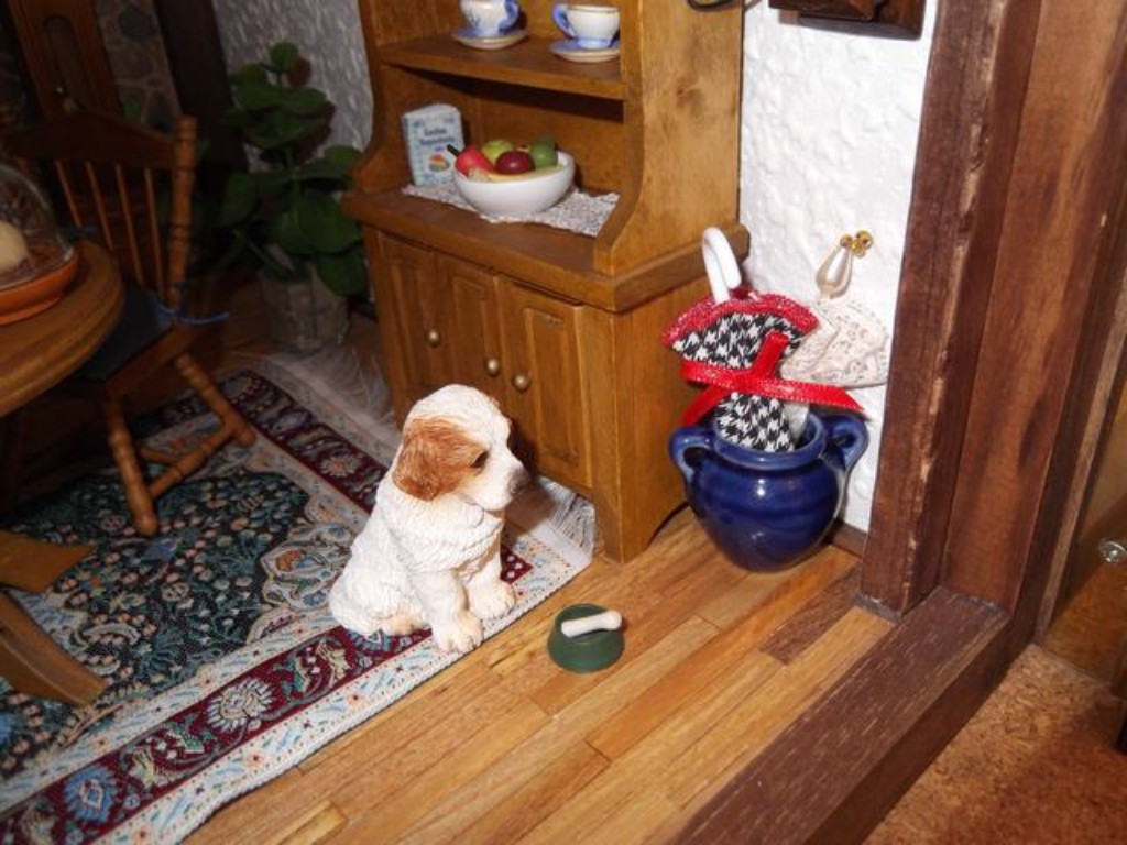 Por supuesto en una de mis casas no podían faltar los perros y este está vigilando su hueso para que no se lo quiten. Tampoco he olvidado poner un par de paraguas que vienen muy bien en el campo. El suelo, lo hice también al estilo de mi padre, tablilla a tablilla ¡un trabajito! y luego lijar y barnizar ¡claro!