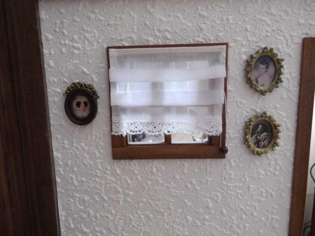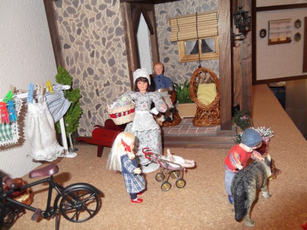 La ventana de la cocina que está sobre el fregadero, da al porche. Tiene una persiana de las de antes hecha tablilla a tablilla y unidas con hilo, que le da realismo.  La señora, lleva un cesto lleno de ropa para tender en el tendedero.Los niños juegan tranquilos mientras su padre los vigila desde el porche.