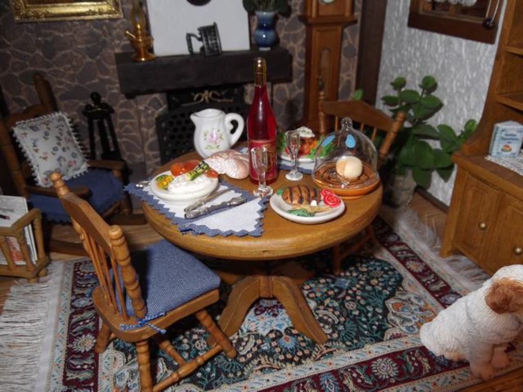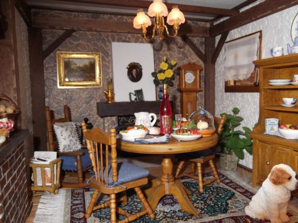 "SALA COMEDOR" Pequeña pero acogedora sala-comedor, en la que la chimenea ayuda a dar esa sensación de estar en una verdadera casa de campo.La alfombra y los cojines los puse porque creo que le dan calidez a la habitación.