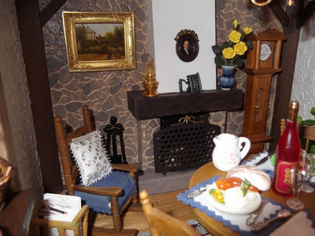 La chimenea tiene luces rojas centelleantes que dan la sensación de tener fuego y dan ganas de sentarse junto a ella para calentarse.Por dentro la pinté de negro para darle más realismo y manché un poco el exterior de la piedra para que de la sensación de estar realmente usada.La mecedora, un mueble que también a mis padres les ha gustado siempre, no podía faltar en una casa como esta.