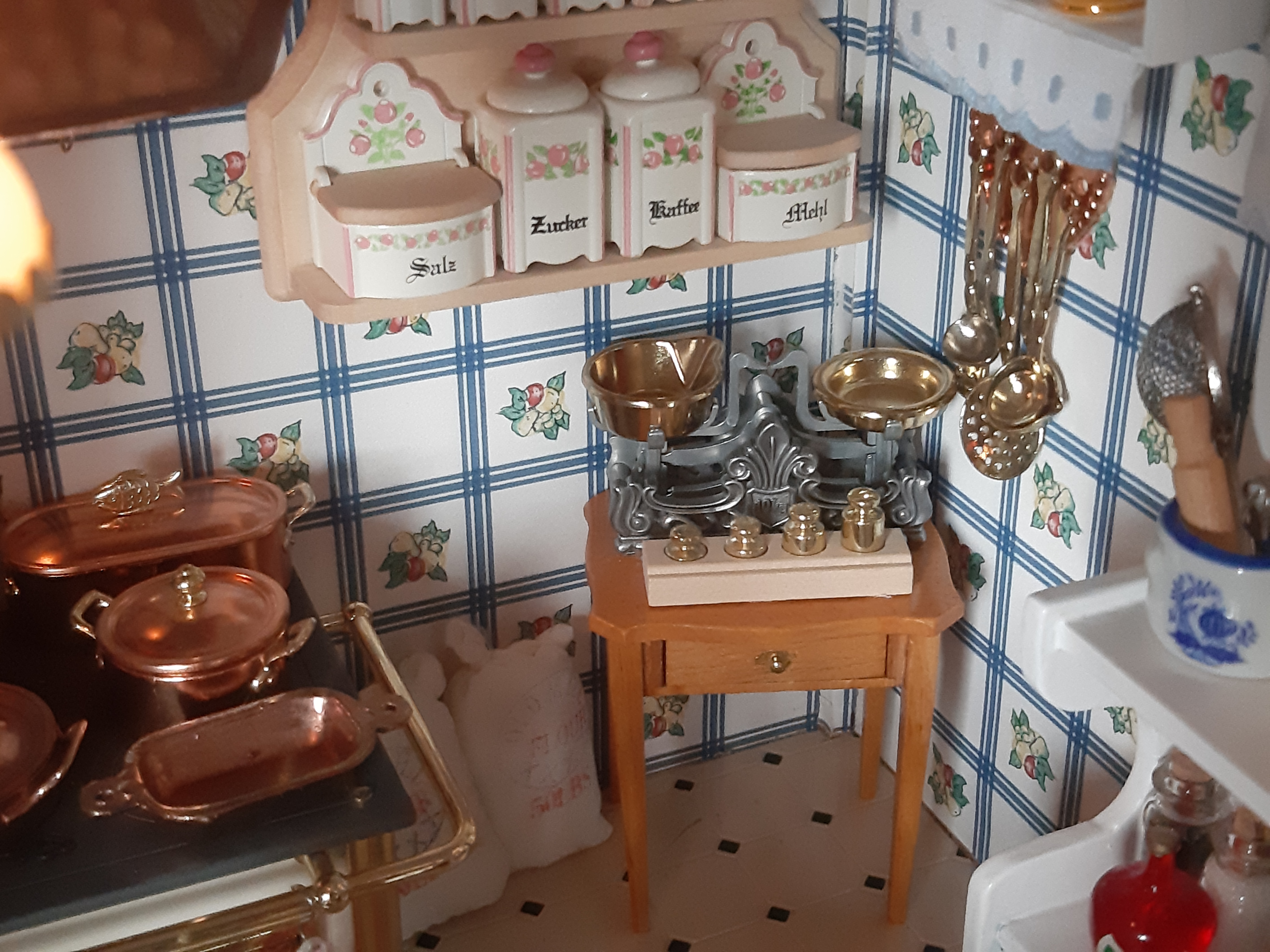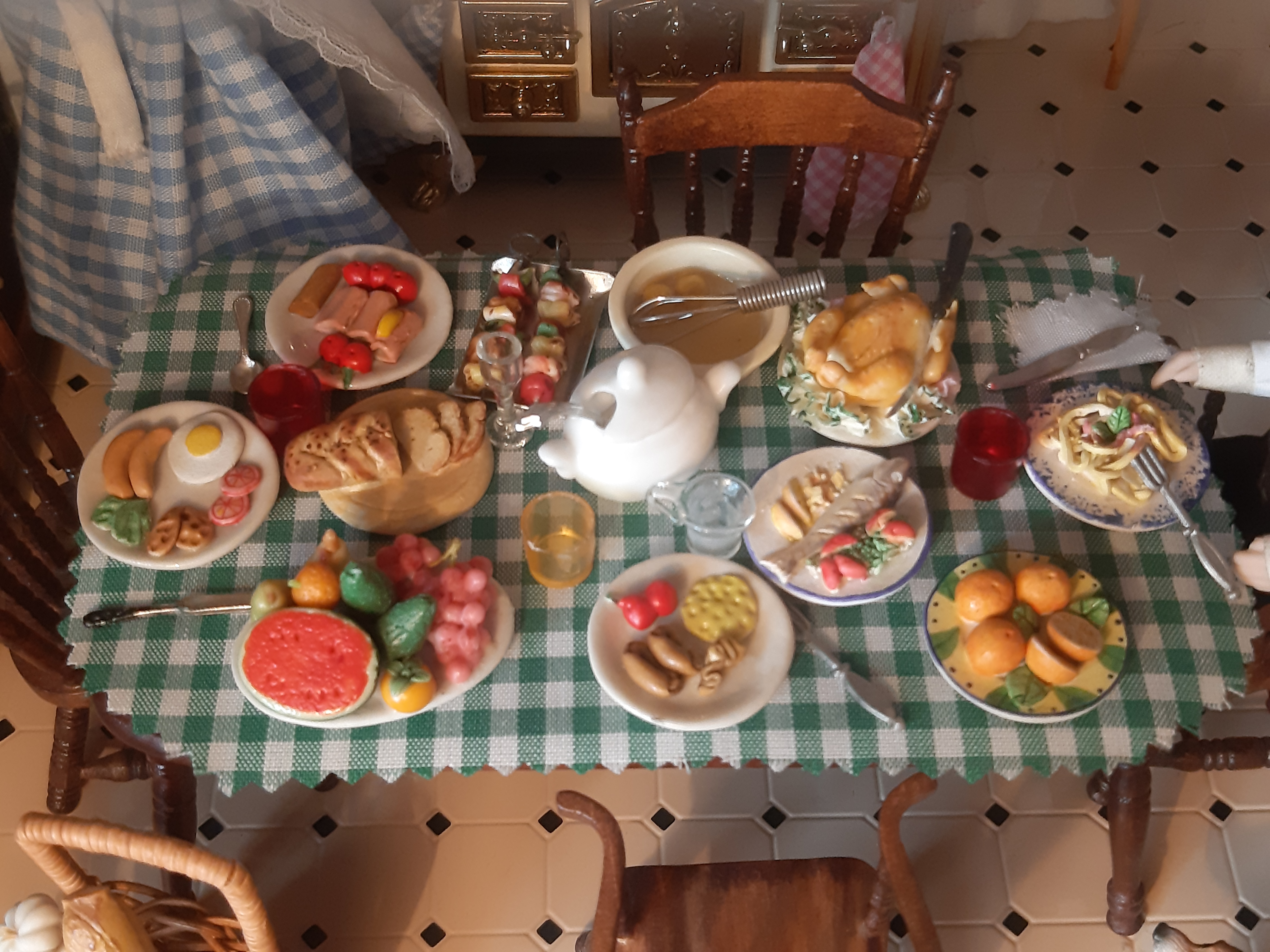 De la decoración se encargó mi madre, dándole tal realismo que invita a entrar y sentarse para admirar los detalles (uno se pregunta si será un gigante mirando una casa real) Las plantas, otra afición de mi madre en la vida real, no podian faltar en este mundo en miniatura. Las lámparas tienen luz real, mi padre se encargó de hacer la instalación eléctrica a toda la casa (proceso laborioso y minucioso) "LA COCINA" Esta era una de las estancias preferidas de mi madre en sus casitas y en la realidad, ya que era buena cocinera y pasaba en la cocina gran parte del día. En esta cocina en miniatura no faltan los detalles cotidianos propios de una cocina real. La mesa repleta de manjares invita a sentarse y disfrutar de ellos, junto a ella espera paciente el perro porque sabe que el niño siempre le da algo ¡mmmmmm! ¡que ricooo! En la tercera imagen vemos al gato, que no parece tener hambre, descansando sobre un mueble con botellas. Pasando el ratón sobre la imagen le oiremos maullar ¡miauuuu! (en la esquina bajo el gato se puede ver uno de los minúsculos, pero reales enchufes de la casa)
